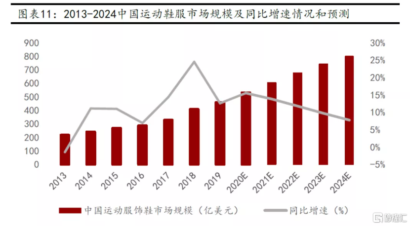 据Euromonitor的数据,我国运动鞋服市场规模从2013年的217.38亿美元上升到2019年的459.5亿美元,年复合增长率超过13%。相比于美国、德国、英国,我国的运动鞋服市场规模增速从2015年至今就遥遥领先,增长动力十足。